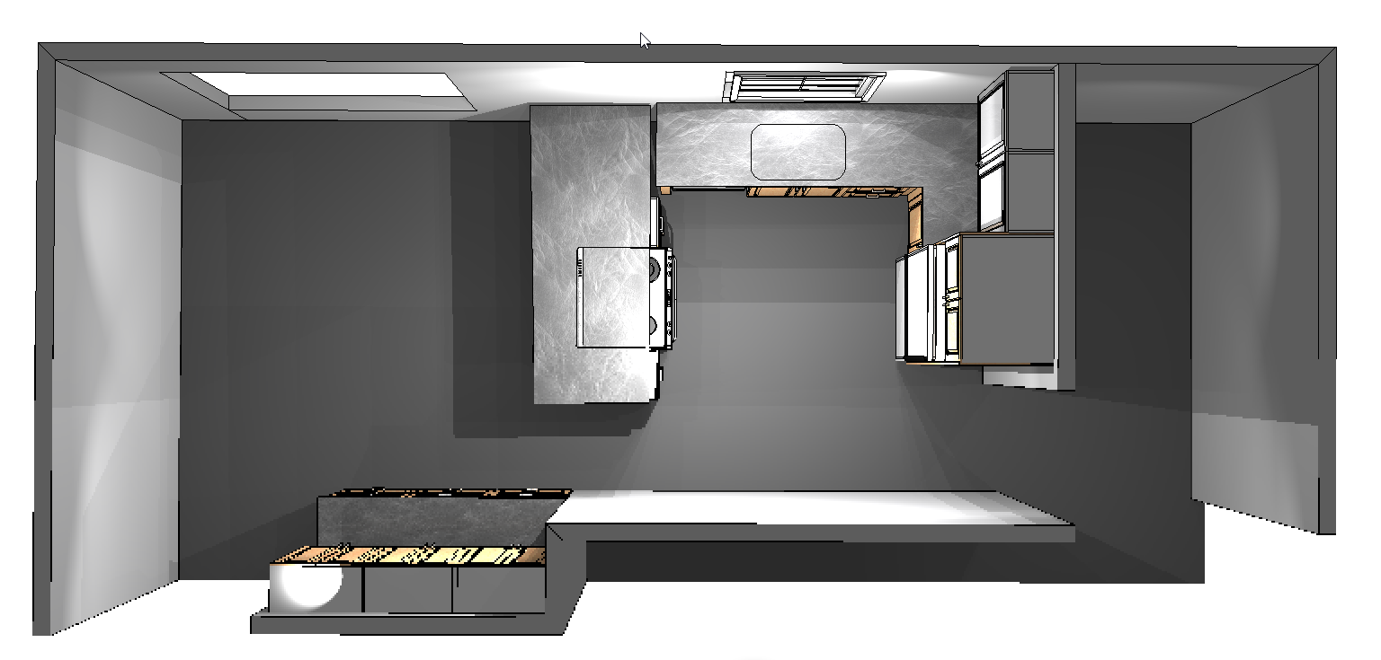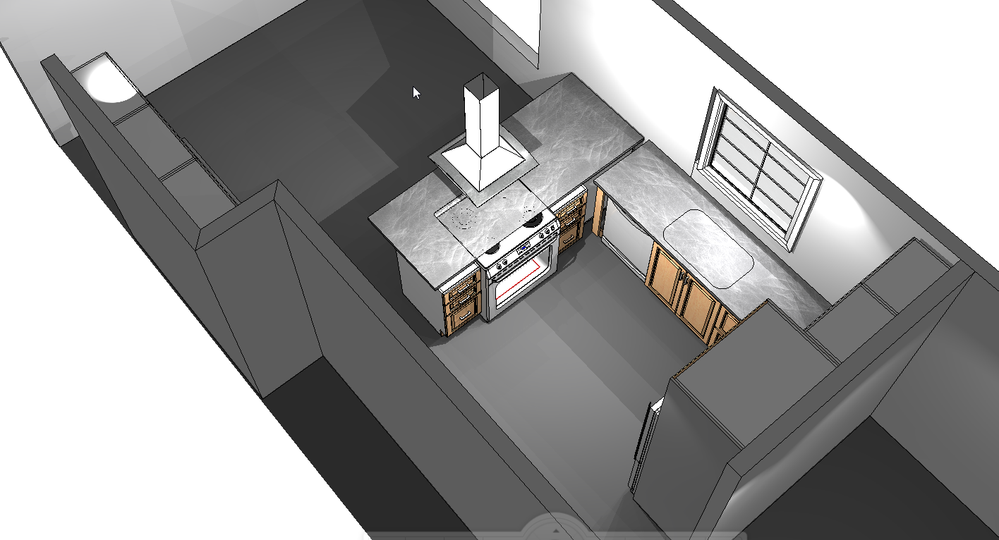 Hood - Relocate ceiling duct for the hood by 12 inches to match new stove location.