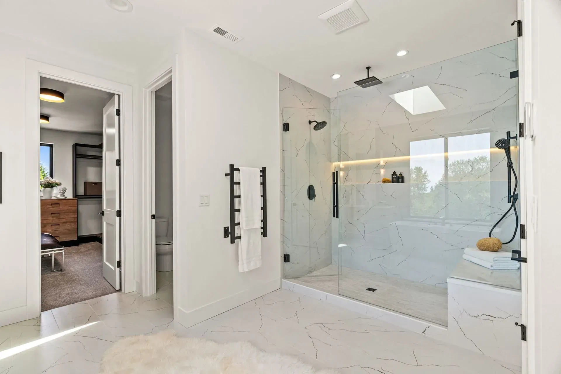 - Fixtures: Vanity, Toilets, Sinks, Shower Systems, Ceiling shower heads, Grab bars, Faucets