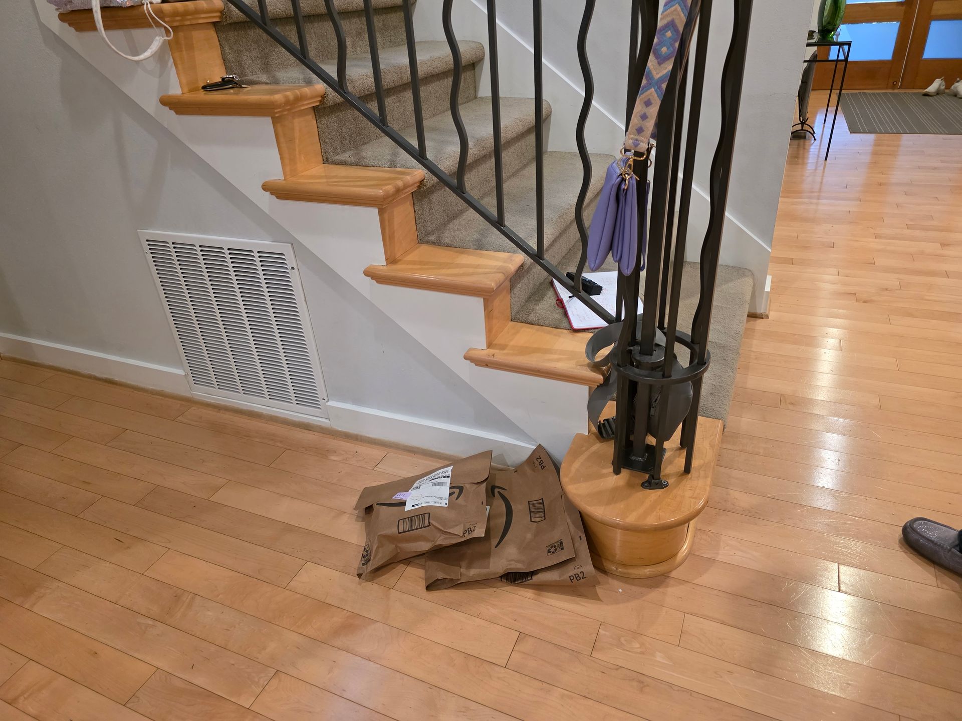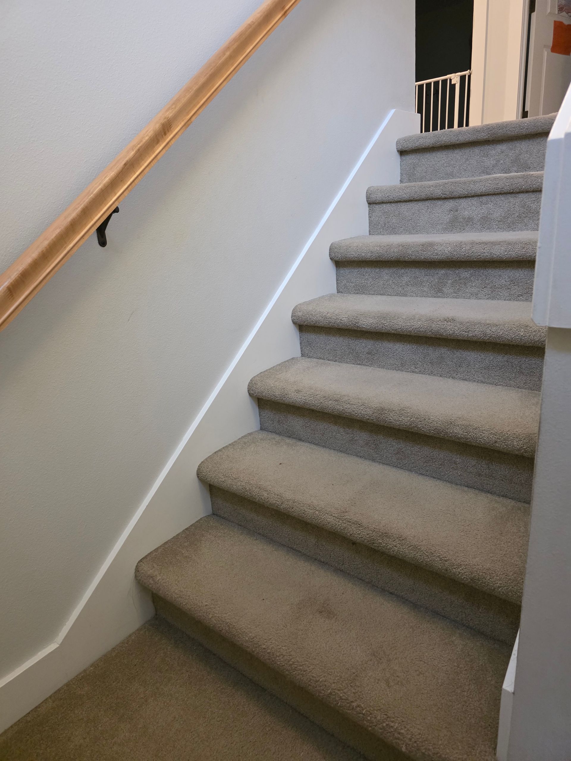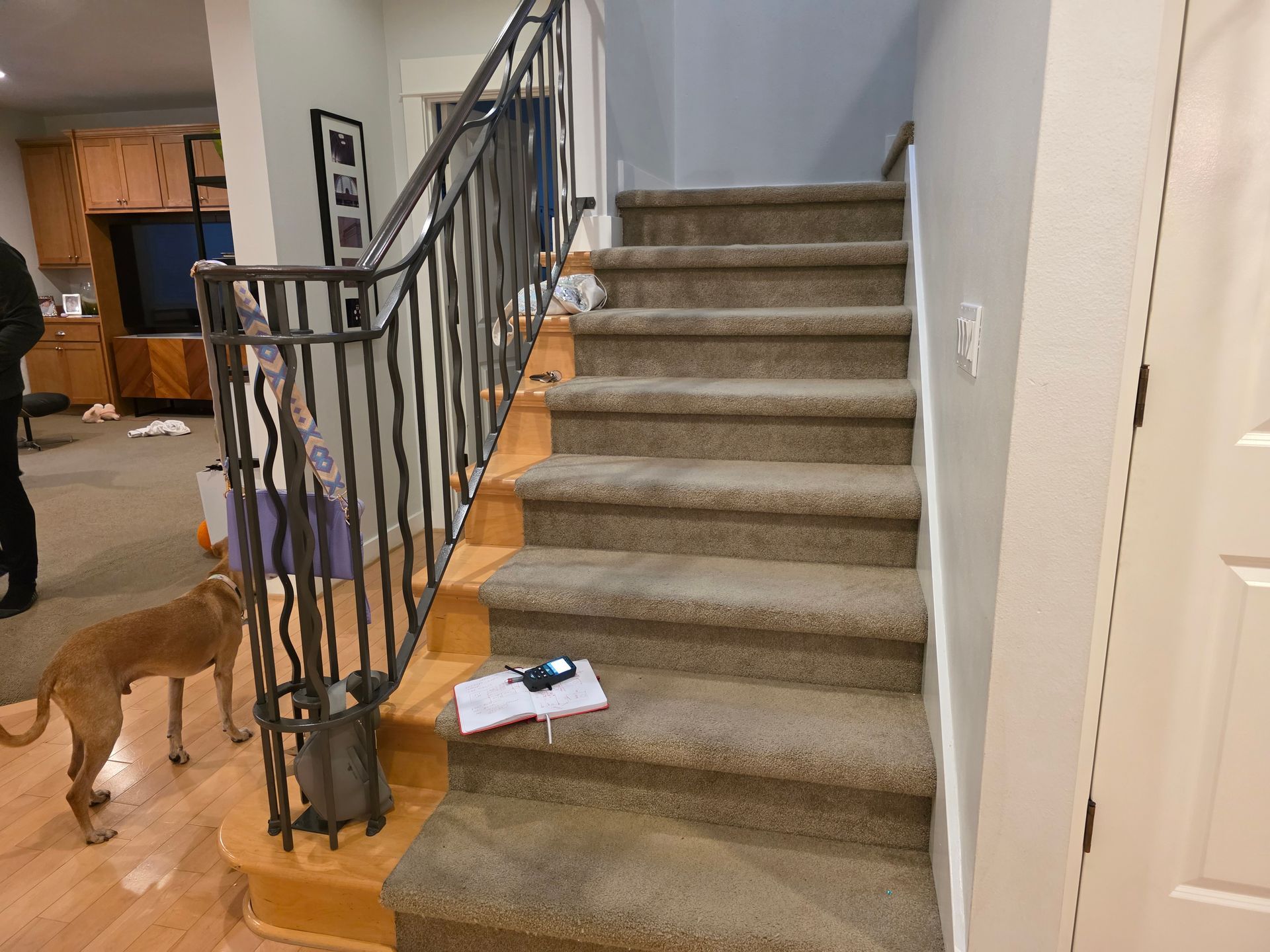 Demolition & Prep Remove carpet, railing, prep, Wood Treads & Risers Installation, First Step Reconfiguration, Custom design / carpentry, Sanding & Finishing, (Wood) Stain or clear coat, New Metal Railing (4 ft), Modern black railing + install, Cleanup & Finishing Touches