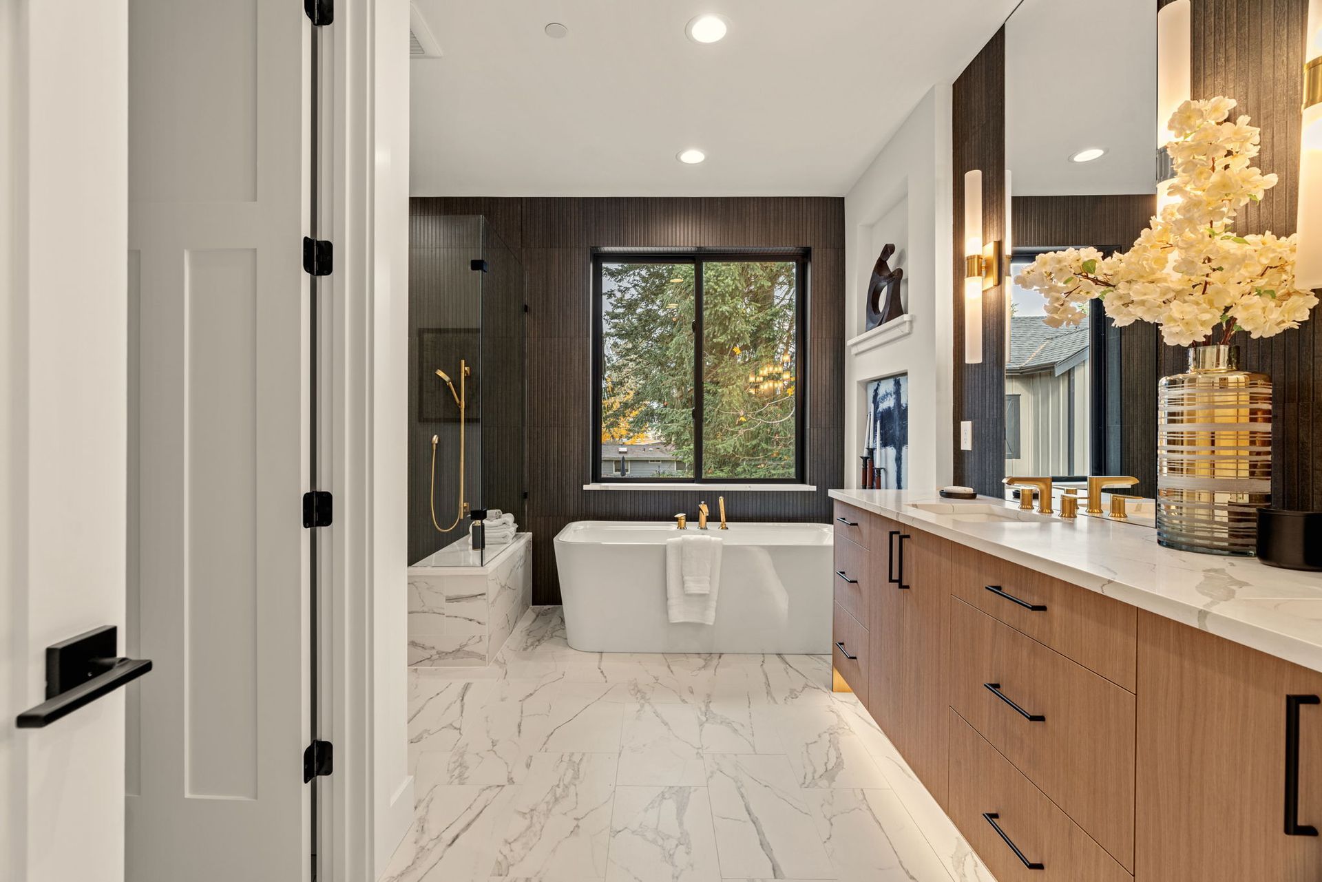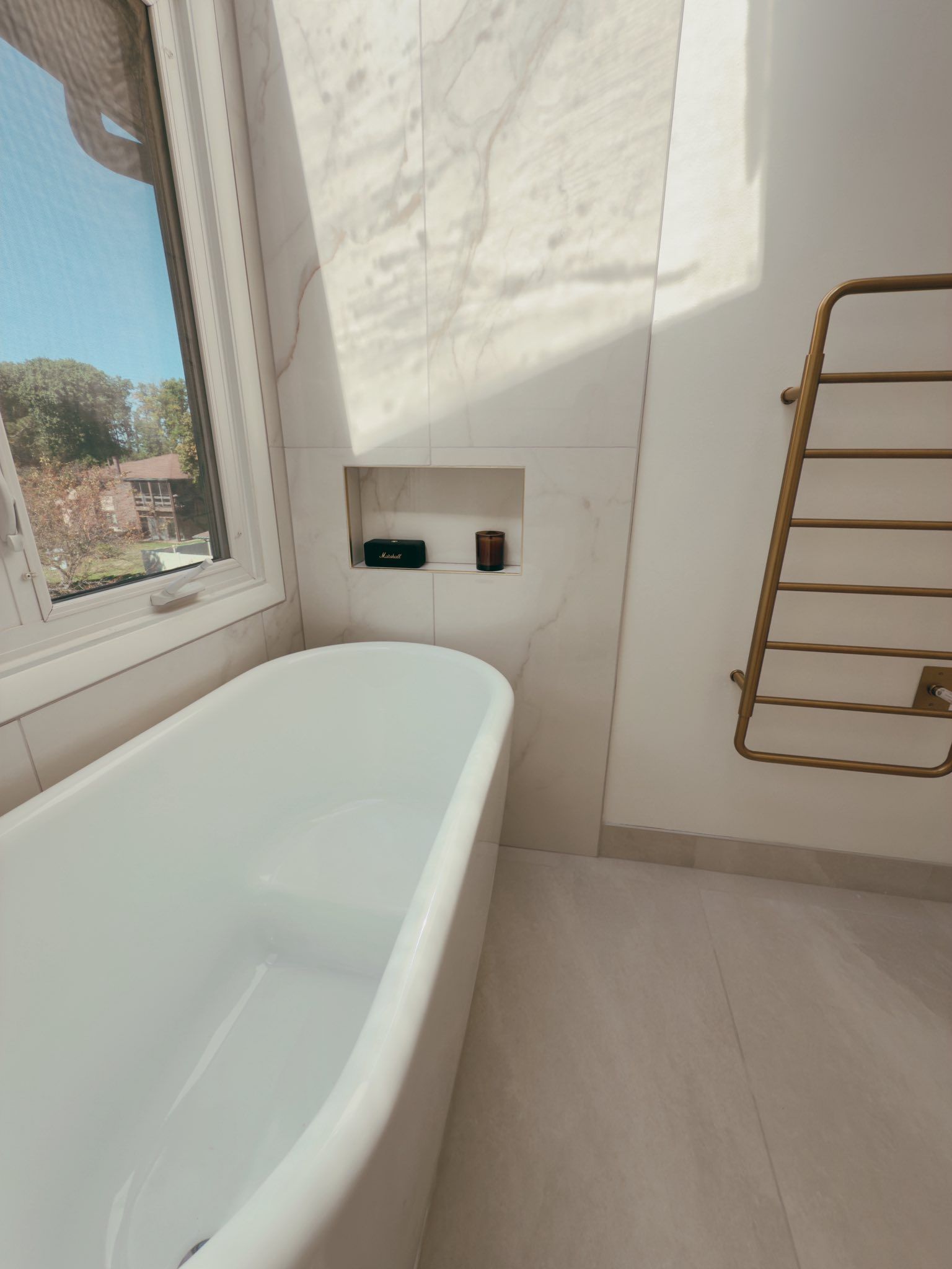 Remove all existing. Replace with stand alone Bath tube. Put niche on the right wall. Put tile up to ceiling around window , to be continuous with front shower wall