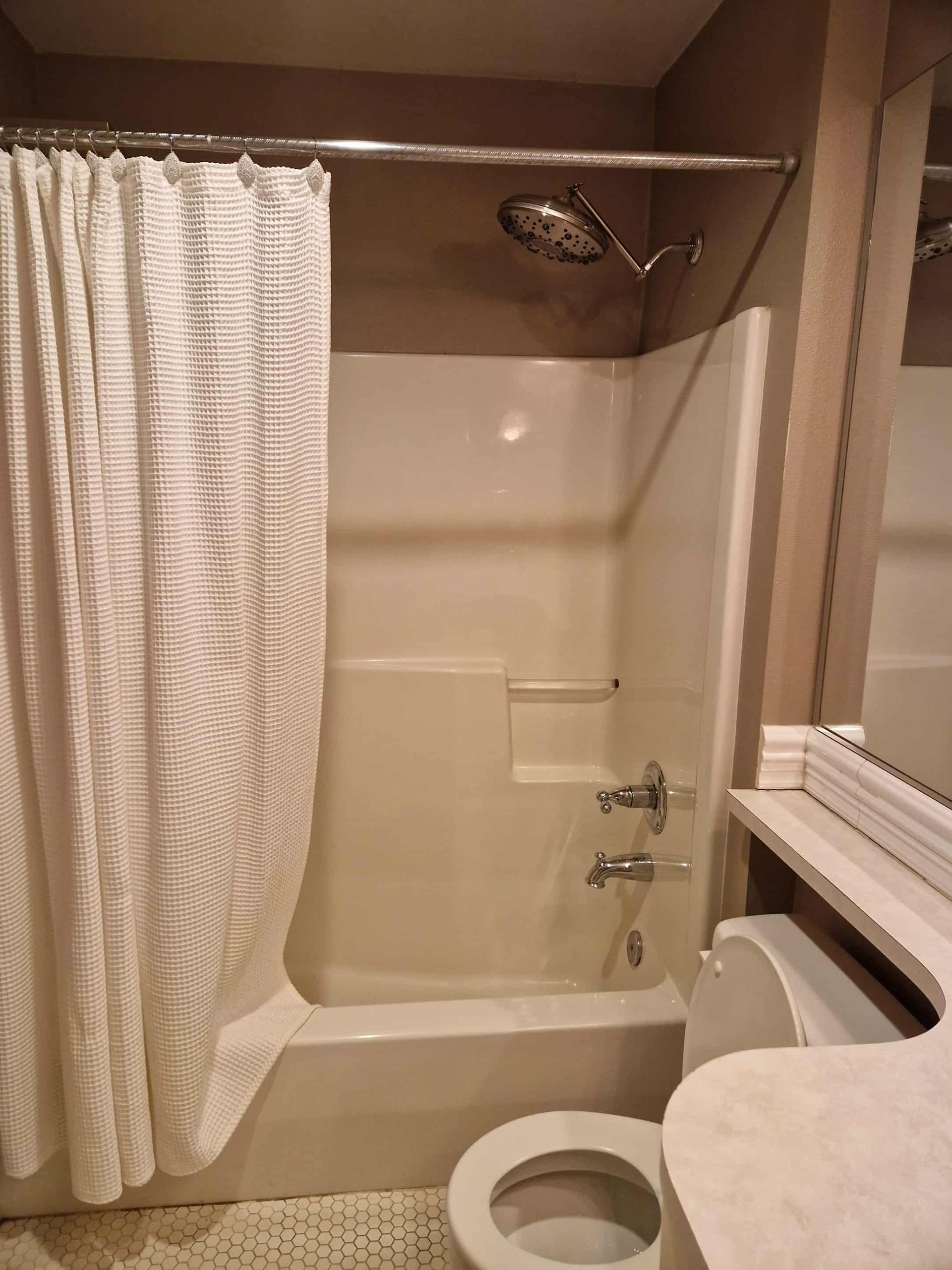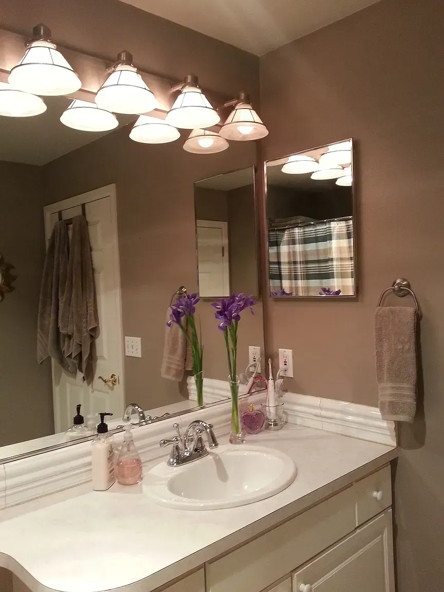 Bathroom - convert bath tube to shower, pre-made base for shower, tile shower area up to ceiling, install new shower system, tile floor, install shower sliding door, install new toilet toilet, install new vanity, new faucet, remove big mirror, change to new modern mirror , install new lighting on the wall, paint walls and ceiling