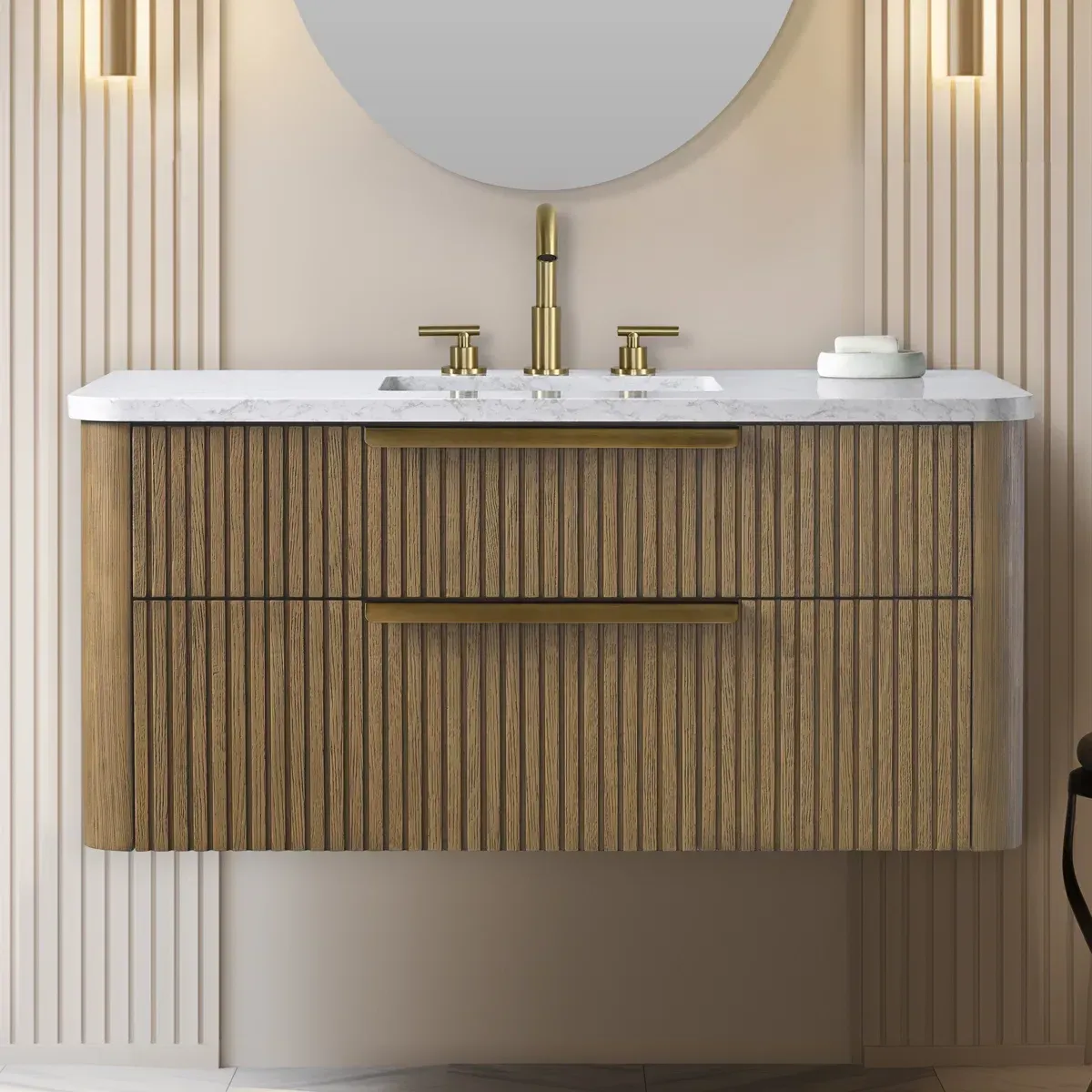 Install 42" floating vanity (or vanity on legs) , mirror, and sink faucet.