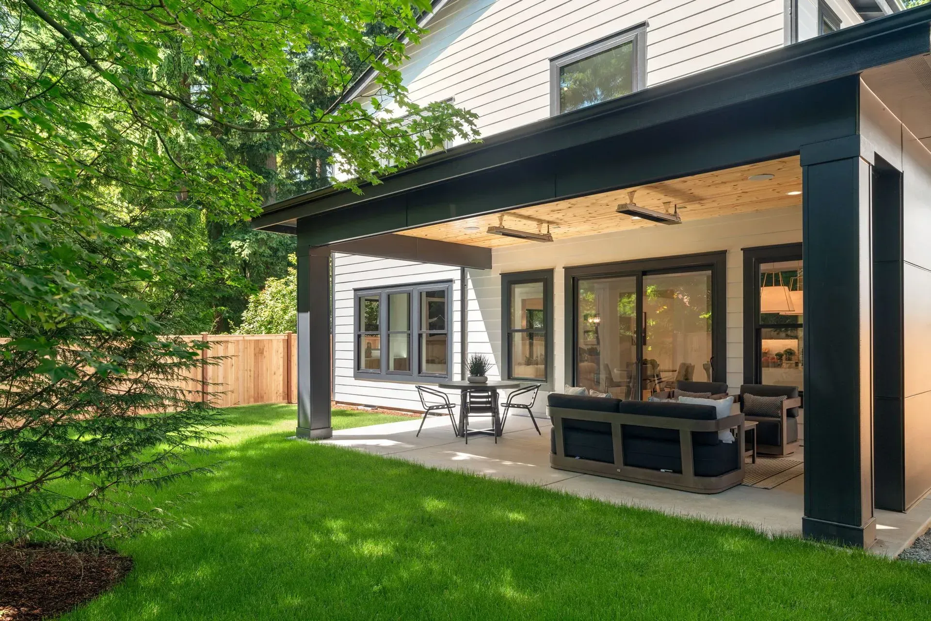 Construct a new attached patio structure connected to the existing house, including a roof system and a reinforced concrete slab foundation. All work will be completed in compliance with local building codes and permitting requirements.