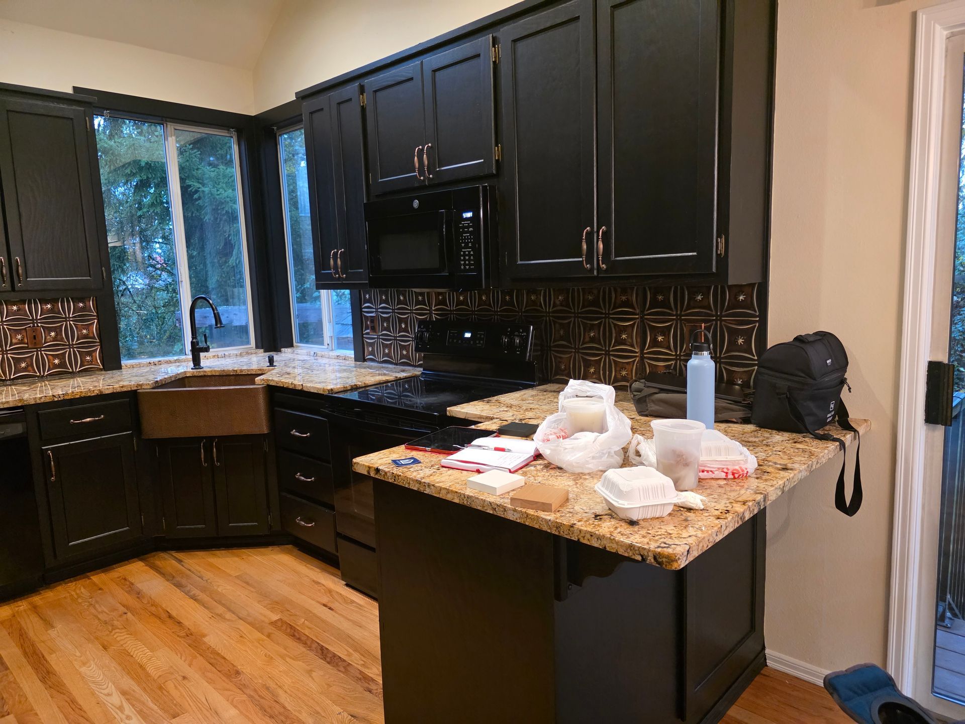 - Remove existing kitchen cabinets, backsplash, and countertop.