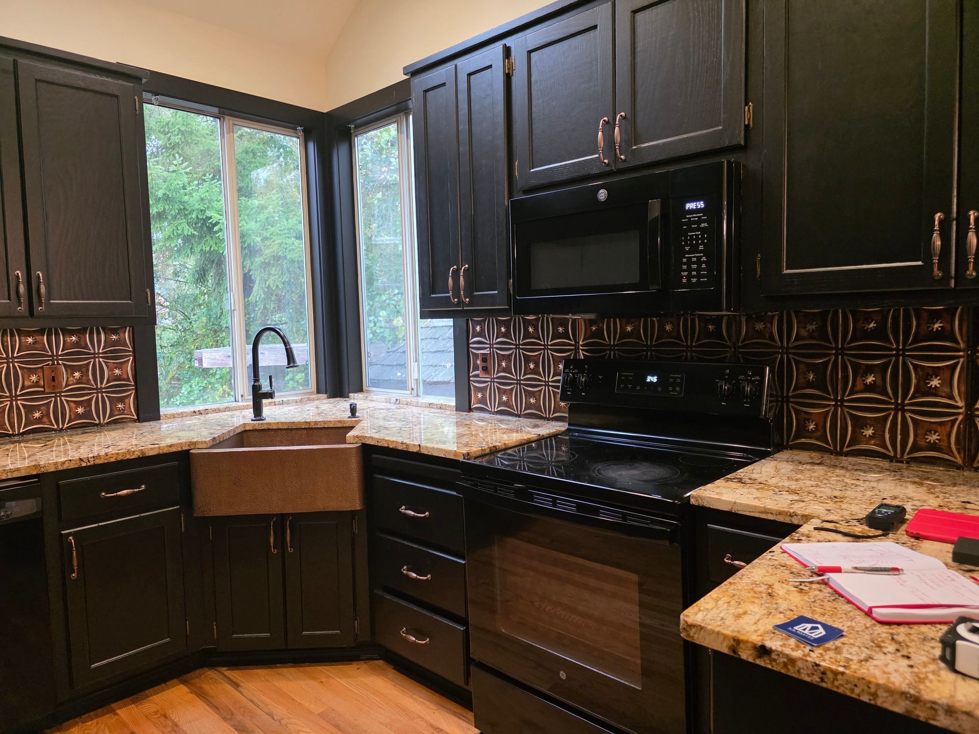 - Verify cabinet alignment near window area for proper transition around the sink corner.
